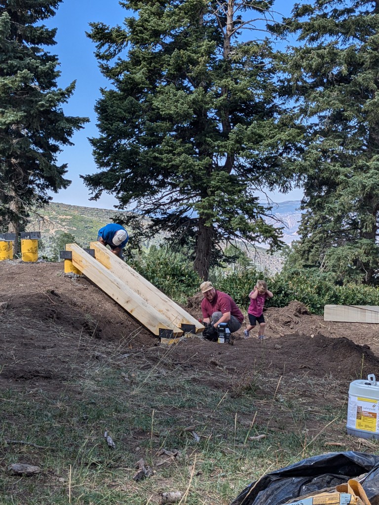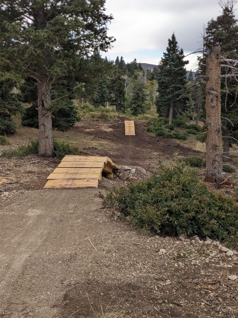 Feature 2 was shaped and reinforced with solid decking, blending into the natural slope of the trail. Feature 3 followed with a smooth, curved ramp that offers a clean takeoff and landing, framed by incredible mountain views.
